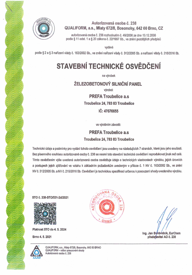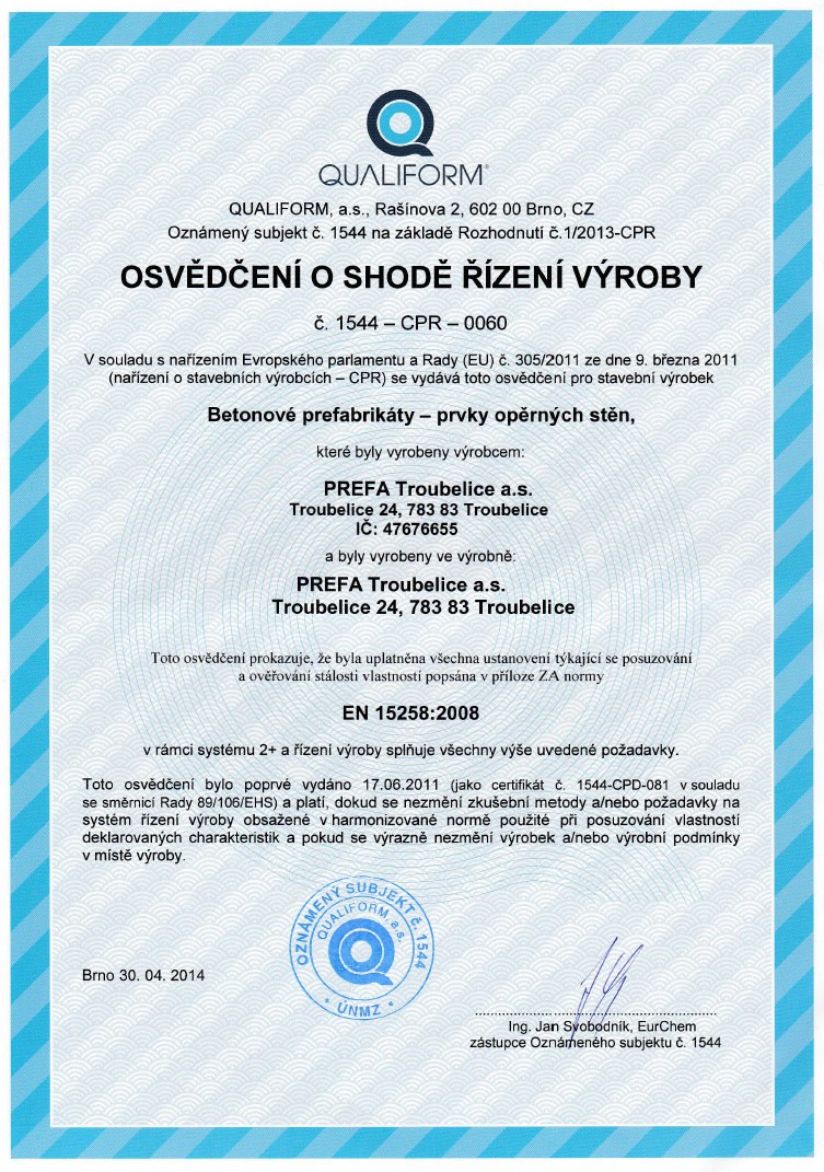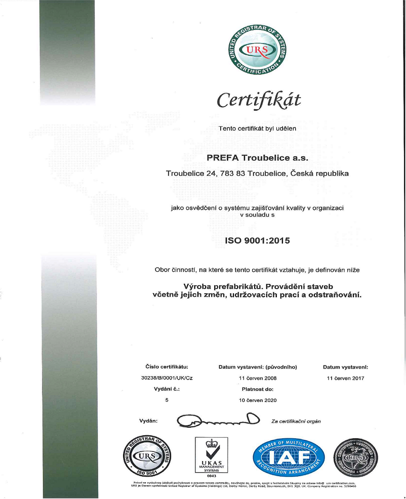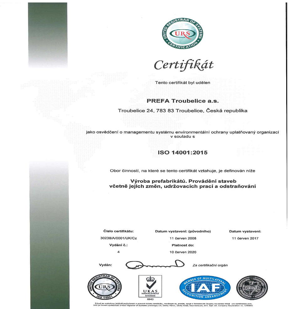 Společnost PREFA Troubelice a.s. zavedla a úspěšně certifikovala systém řízení jakosti podle ČSN EN ISO 9001 a Systémy environmentálního managementu podle ČSN EN ISO 14001.